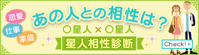 運命星鑑定 気になるあの人は何星人?生年月日を入力して占ってみましょう。 例)1992年1月19日→19920119 占う 今日の相性 最適日占い 家族の相性 お悩み相談室 ママと子どもの相性 一週間のラッキーカラー ▼占いたい項目をお選びください 【一人】2026年あなたの運命を占う 【二人】気になる人との相性は? あなたのお名前(ニックネーム)*必須 あなたの生年月日(例:19800101)*必須 相手のお名前(ニックネーム) 相手の生年月日(例:19800101) ★★「2026年の運命」の購入前に★★ 会員登録後に【開運カード付き】2026年の運命と相性セット/2026年の運命と相性セット/運命セットのいずれかを購入すると、合計で651ポイントをプレゼントします!