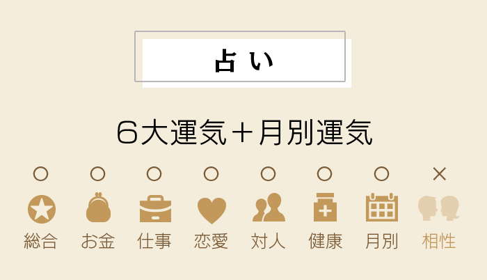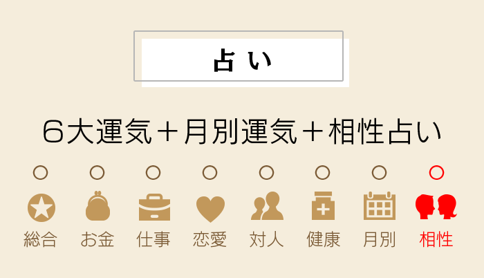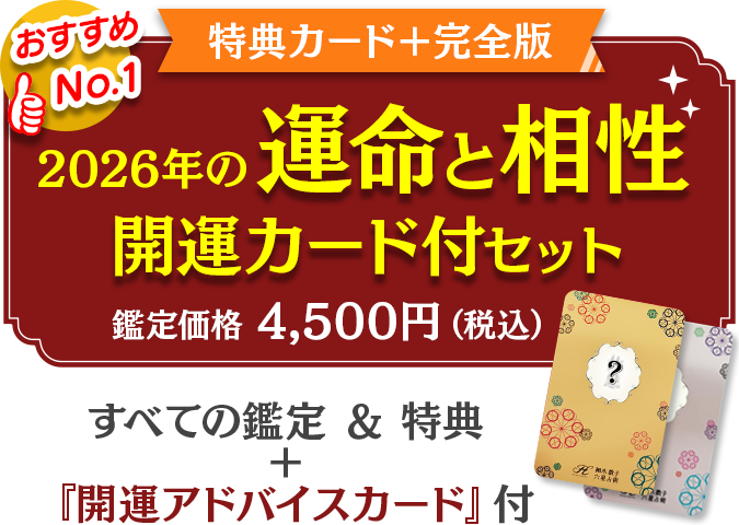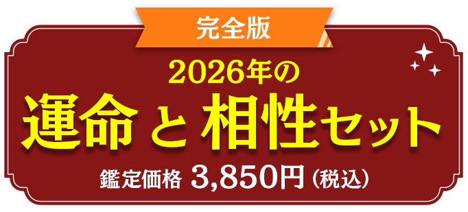 あの人との本当の関係が今、明らかに!「スペシャルセット」と「運命と相性セット」には、衝撃の相性占い1名分が無料付属。さらに毎日チェックできる「相性カレンダー」で、二人の運命の行方を見逃さないで!あの人との本当の関係が今、明らかに!「スペシャルセット」と「運命と相性セット」には、衝撃の相性占い1名分が無料付属。さらに毎日チェックできる「相性カレンダー」で、二人の運命の行方を見逃さないで!