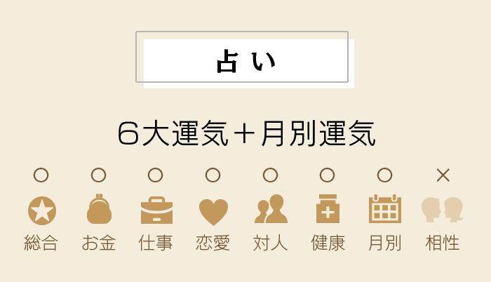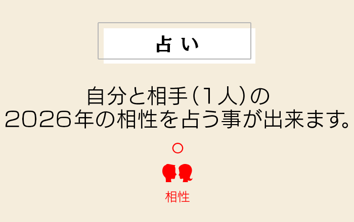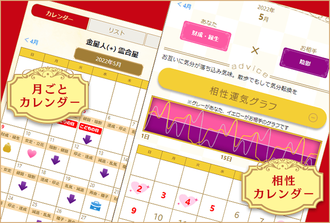 スマホやPCからwebで確認できる運気カレンダーです。毎日の運気や先々のラッキーカラーが確認できます。さらに「【開運カード付】2026年の運命と相性セット」「運命と相性セット」をご購入の方には、相性占いをしたお相手の運気もカレンダーに追加されます。お二人の運気の良い日・悪い日も一目でわかるので、ぜひ活用してください。